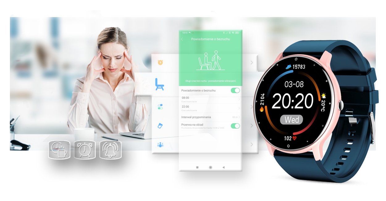 Uzyskaj harmonię pomiędzy aktywnością a wypoczynkiem! Pomoże Ci w tym takie narzędzie, jak monitor braku aktywności. Jeżeli się zasiedzisz – smartwatch GRAVITY przypomni Ci o dłuższym czasie bez aktywności. Koniec wymówek, Twój nowy smartwatch Gravity wie, że ruch to zdrowie!