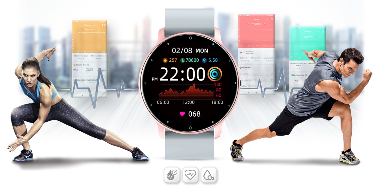 Dzięki sensorowi możesz w każdej chwili zmierzyć lub wykonać pomiar: ciśnienie krwi, tętno lub saturację – zawartość tlenu we krwi w swoim organizmie. Kontroluj wyniki podczas każdej aktywności fizycznej. Niezależnie czy jeździsz na rowerze, biegasz, czy też po prostu jesteś w pracy lub odpoczywasz. Twój smartwatch GRAVITY stanie się osobistym asystentem dbającym o twoje zdrowie każdego dnia.