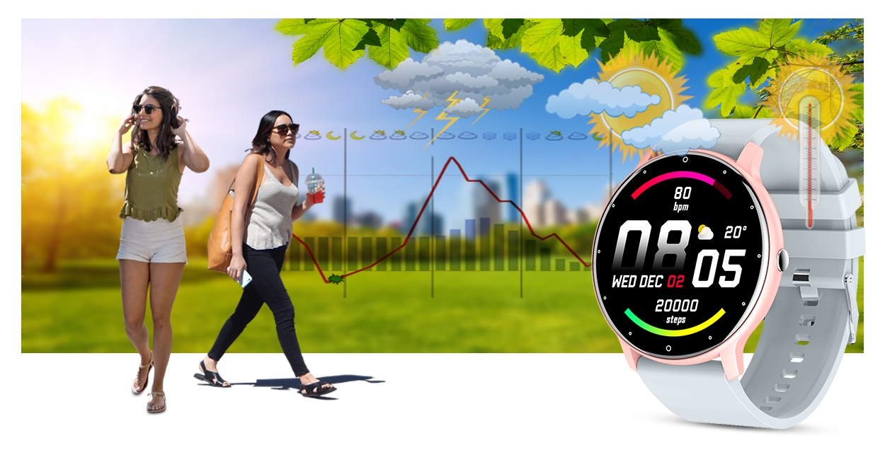 Smartwatch po podłączeniu z aplikacją wyświetla dane o pogodzie. Teraz wystarczy jedno spojrzenia na smartwatcha i już wiesz jaka pogoda będzie Ci towarzyszyć w najbliższym czasie. Dzięki pogodzie w smartwatchu możesz lepiej zaplanować swoją aktywność i ubrać się odpowiednio do otaczającej aury!