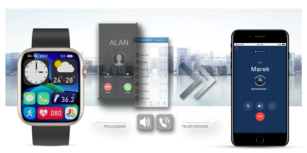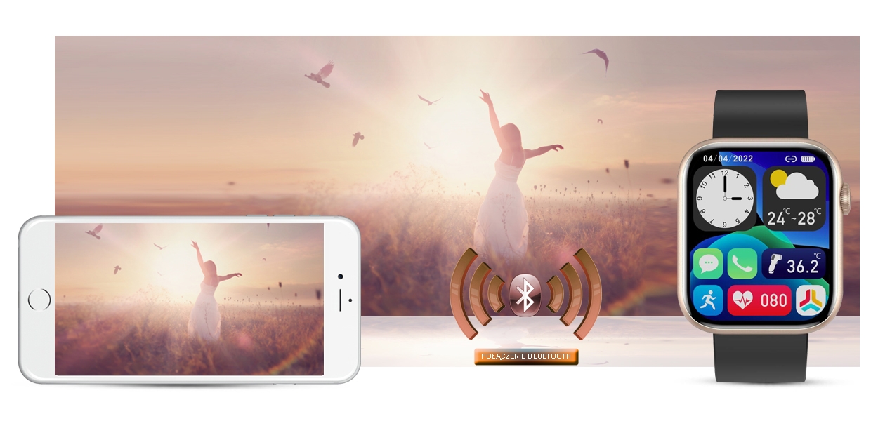 Ten smartwatch możesz połączyć ze swoim Smartfonem. Kompatybilność z systemem Android 4.4 i nowszy oraz iOS 8.0 i nowszy. Oznacza to, że smartwatch połączy się ze wszystkimi telefonami na systemie ANDROID i iOS.