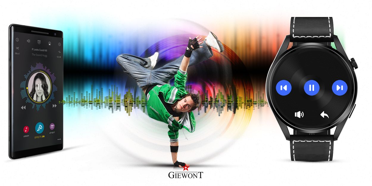 Sterowanie muzyką Każdy lubi słuchać swoją ulubioną muzykę. Dzięki bezprzewodowemu połączeniu poprzez bluetooth, od teraz możesz sterować odtwarzaczem muzycznym twojego telefonu komórkowego z poziomu smartwatcha. W ten sposób możesz uprawiać sport w rytm ulubionej muzyki lub relaksować się bez konieczności wyciągania smartfona. |