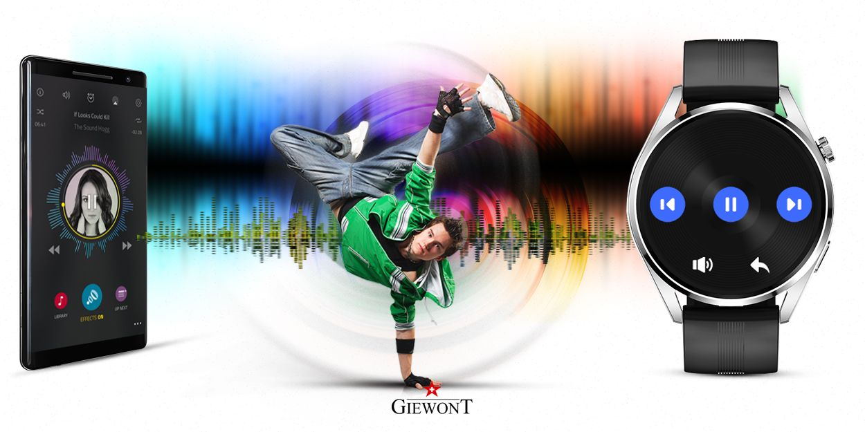 Sterowanie muzyką Każdy lubi słuchać swoją ulubioną muzykę. Dzięki bezprzewodowemu połączeniu poprzez bluetooth, od teraz możesz sterować odtwarzaczem muzycznym twojego telefonu komórkowego z poziomu smartwatcha. W ten sposób możesz uprawiać sport w rytm ulubionej muzyki lub relaksować się bez konieczności wyciągania smartfona. |
