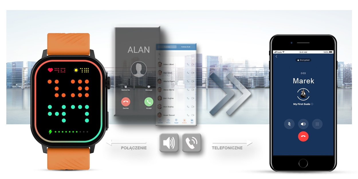 Po sparowaniu smartwatcha z twoim smartfonem, możesz bezproblemowo odbierać i wykonywać połączenia telefoniczne. Wbudowany głośnik oraz mikrofon pozwala rozmawiać bez konieczności wyciągania telefonu komórkowego.
