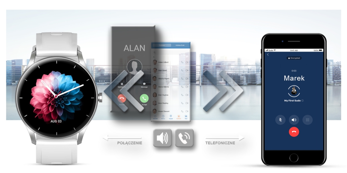 Po sparowaniu smartwatcha z twoim smartfonem, możesz bezproblemowo odbierać i wykonywać połączenia telefoniczne. Wbudowany głośnik oraz mikrofon pozwala rozmawiać bez konieczności wyciągania telefonu komórkowego.