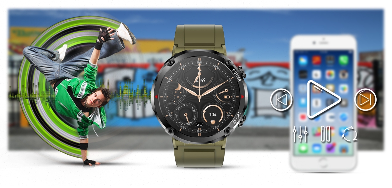 Każdy lubi słuchać swoją ulubioną muzykę. Dzięki bezprzewodowemu połączeniu poprzez bluetooth, od teraz możesz sterować odtwarzaczem muzycznym twojego telefonu komórkowego z poziomu smartwatcha. W ten sposób możesz uprawiać sport w rytm ulubionej muzyki lub relaksować się bez konieczności wyciągania smartfona.