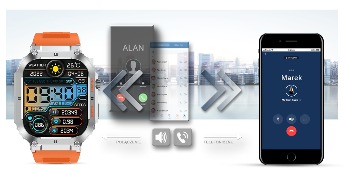 Po sparowaniu smartwatcha z twoim smartfonem, możesz bezproblemowo odbierać i wykonywać połączenia telefoniczne. Wbudowany głośnik oraz mikrofon pozwala rozmawiać bez konieczności wyciągania telefonu komórkowego.