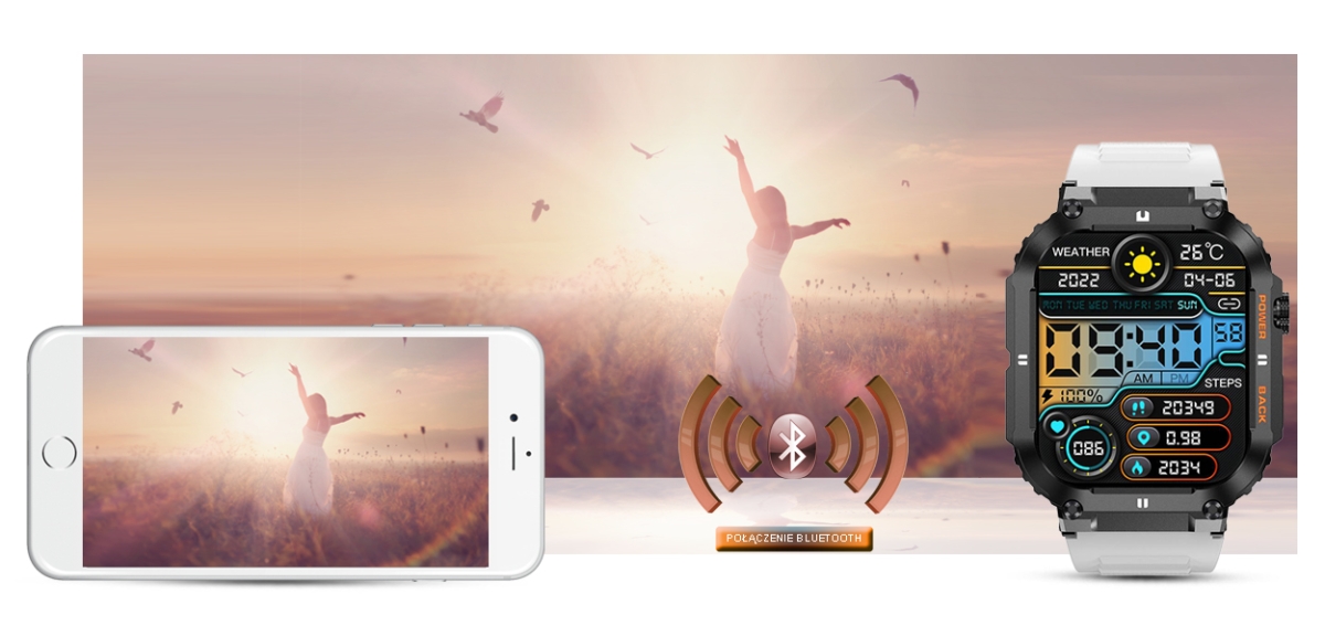 Ten smartwatch możesz połączyć ze swoim Smartfonem. Kompatybilność z systemem Android 5.0 i nowszy oraz iOS 8.0 i nowszy. Oznacza to, że smartwatch połączy się ze wszystkimi telefonami na systemie ANDROID i iOS.