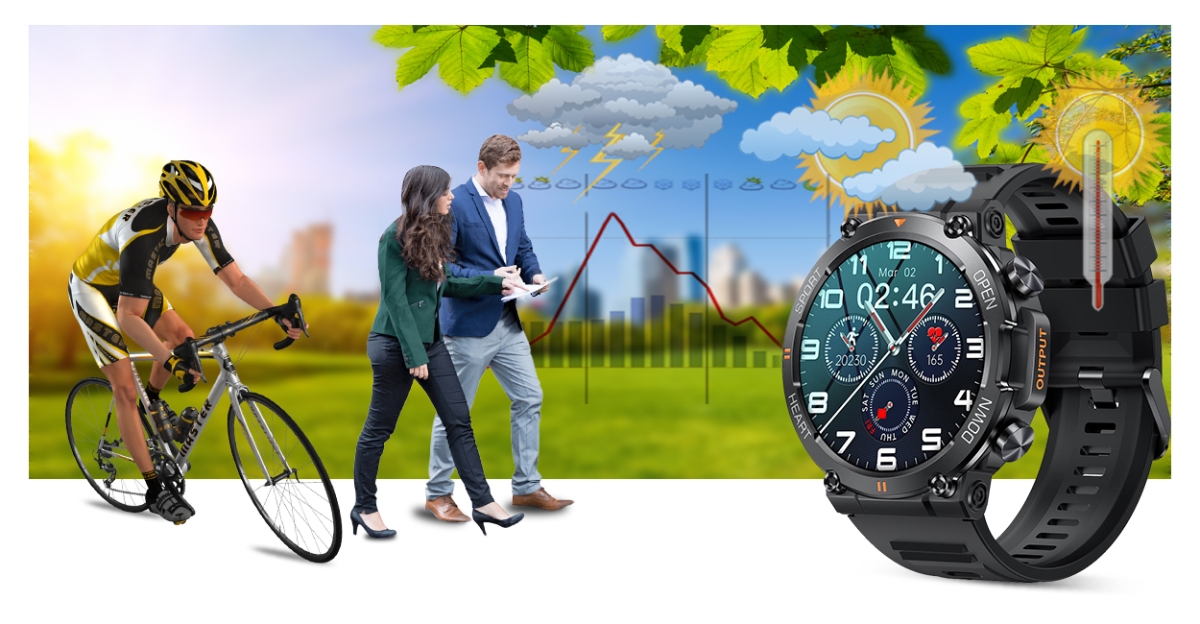 Smartwatch po podłączeniu z aplikacją wyświetla dane o pogodzie. Teraz wystarczy jedno spojrzenia na smartwatcha i już wiesz jaka pogoda będzie Ci towarzyszyć w najbliższym czasie. Dzięki pogodzie w smartwatchu możesz lepiej zaplanować swoją aktywność i ubrać się odpowiednio do otaczającej aury!