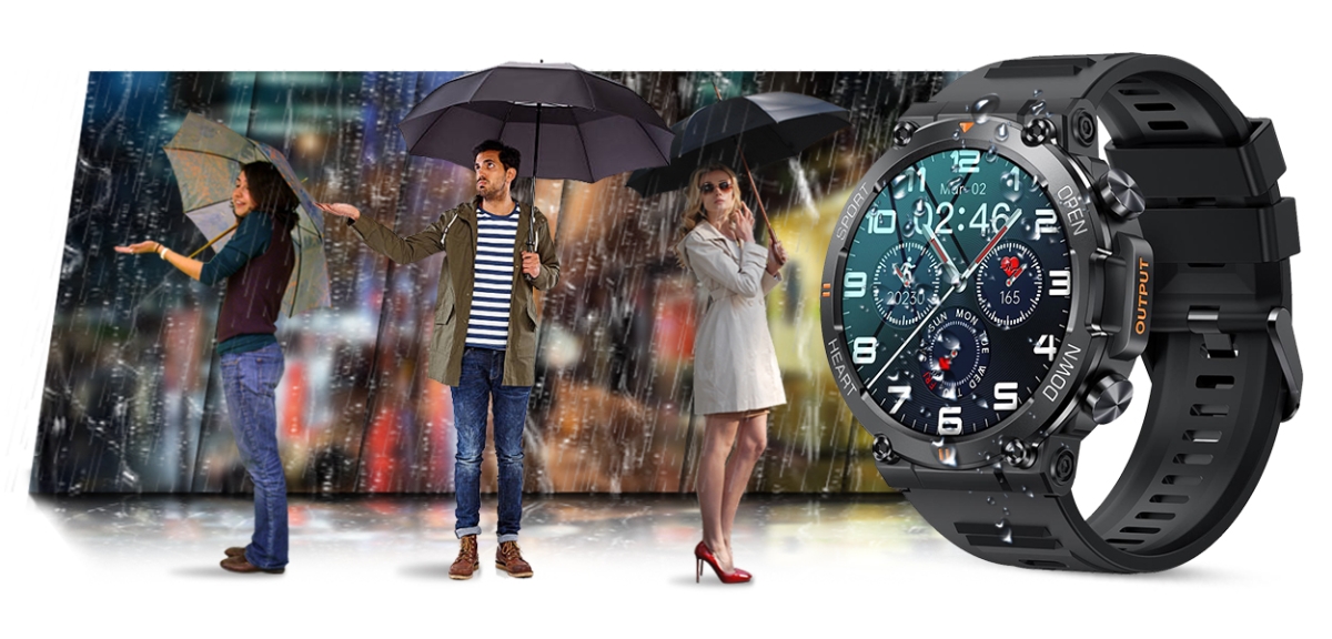Dobry sprzęt powinien nadążać za właścicielem, dlatego smartwatch posiada klasę wodoszczelności IP67. Smartwatch odporny jest na lekkie zachlapania i delikatny kontakt z wodą. Smartwatch jest również odporny na delikatny pył i kurz atmosferyczny.W smartwatchu nie można nurkować, skakać do wody, używać w saunie lub narażać na kontakt z słoną, gorącą lub lodowatą wodą.