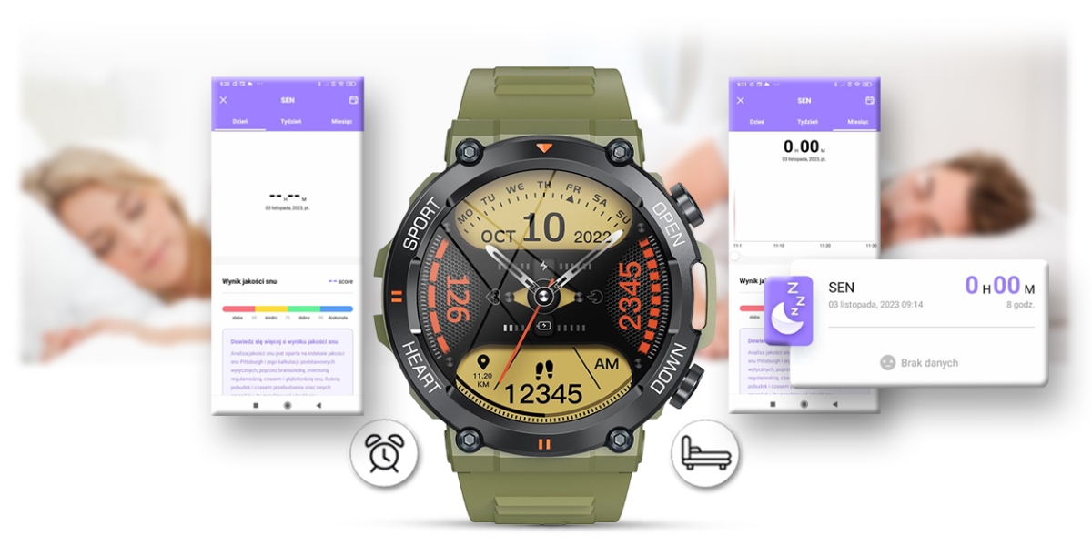 Funkcja ta pozwala monitorować czas i jakoś snu każdej nocy. Po zsynchronizowaniu danych z aplikacją możesz sprawdzać i analizować jakość swojego snu. Historia pokaże jak śpisz i czy twój sen jest dobrej jakości. Po ciężkim dniu każdy musi się wyspać, żeby nabrać sił na kolejny dzień i w tym pomoże Ci ten smartwatch.