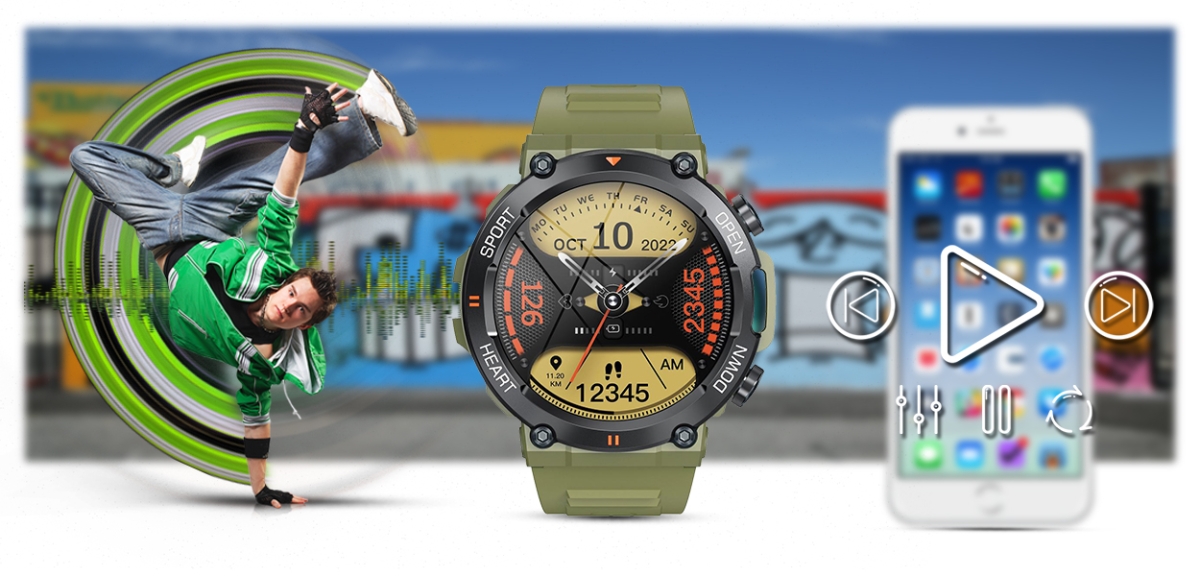 Każdy lubi słuchać swoją ulubioną muzykę. Dzięki bezprzewodowemu połączeniu poprzez bluetooth, od teraz możesz sterować odtwarzaczem muzycznym twojego telefonu komórkowego z poziomu smartwatcha. W ten sposób możesz uprawiać sport w rytm ulubionej muzyki lub relaksować się bez konieczności wyciągania smartfona.