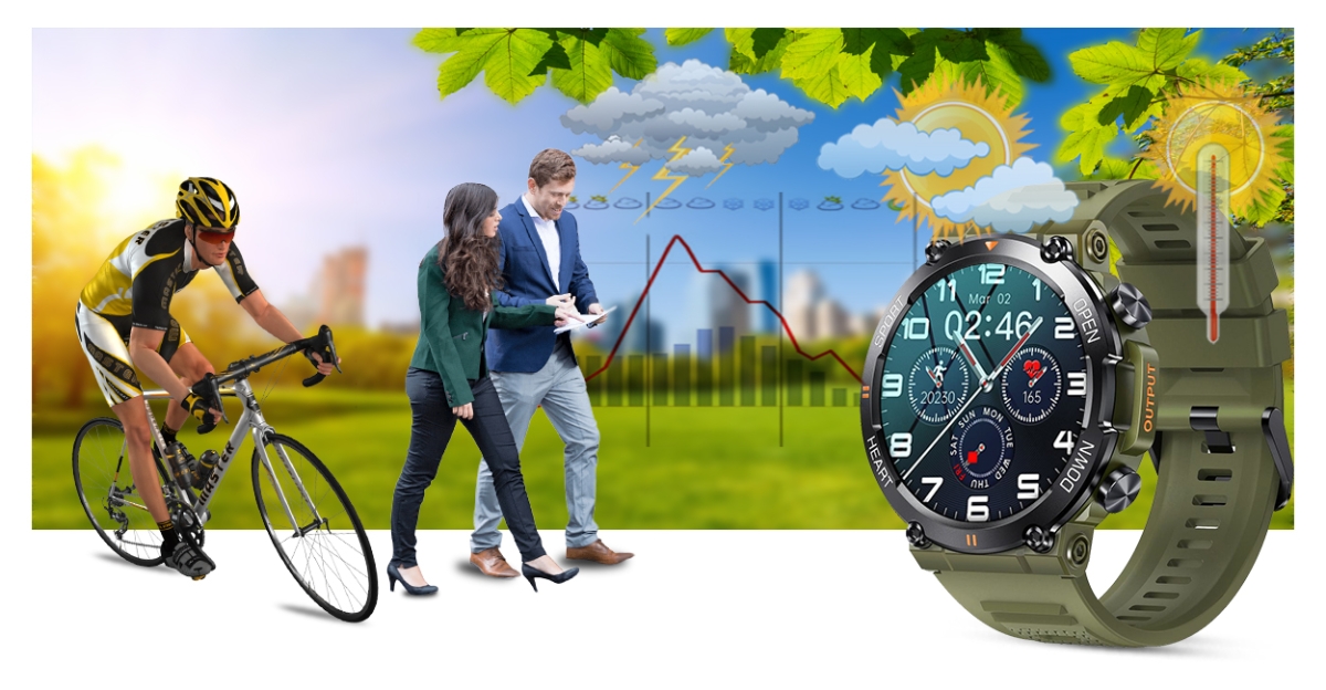 Smartwatch po podłączeniu z aplikacją wyświetla dane o pogodzie. Teraz wystarczy jedno spojrzenia na smartwatcha i już wiesz jaka pogoda będzie Ci towarzyszyć w najbliższym czasie. Dzięki pogodzie w smartwatchu możesz lepiej zaplanować swoją aktywność i ubrać się odpowiednio do otaczającej aury!