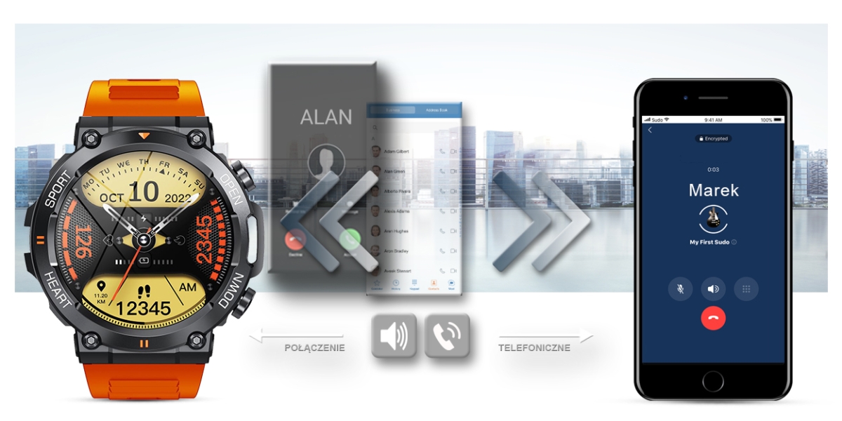 Ten smartwatch możesz połączyć ze swoim Smartfonem. Kompatybilność z systemem Android 4.4 i nowszy oraz iOS 8.0 i nowszy. Oznacza to, że smartwatch połączy się ze wszystkimi telefonami na systemie ANDROID i iOS.