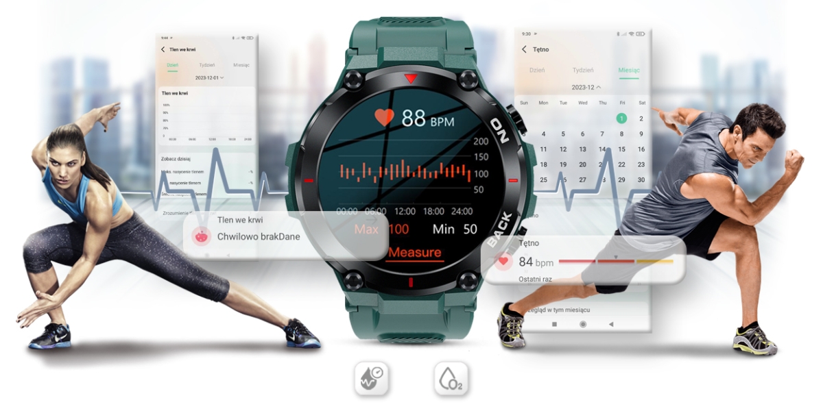 Dzięki sensorowi możesz w każdej chwili zmierzyć lub wykonać pomiar: tętno lub saturację – zawartość tlenu we krwi w swoim organizmie. Kontroluj wyniki podczas każdej aktywności fizycznej. Niezależnie czy jeździsz na rowerze, biegasz, czy też po prostu jesteś w pracy lub odpoczywasz. Twój smartwatch GRAVITY stanie się osobistym asystentem dbającym o twoje zdrowie każdego dnia.