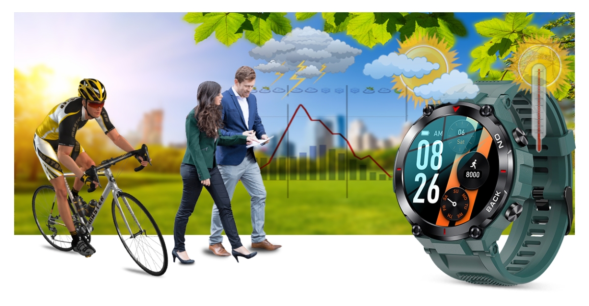 Smartwatch po podłączeniu z aplikacją wyświetla dane o pogodzie. Teraz wystarczy jedno spojrzenia na smartwatcha i już wiesz jaka pogoda będzie Ci towarzyszyć w najbliższym czasie. Dzięki pogodzie w smartwatchu możesz lepiej zaplanować swoją aktywność i ubrać się odpowiednio do otaczającej aury!