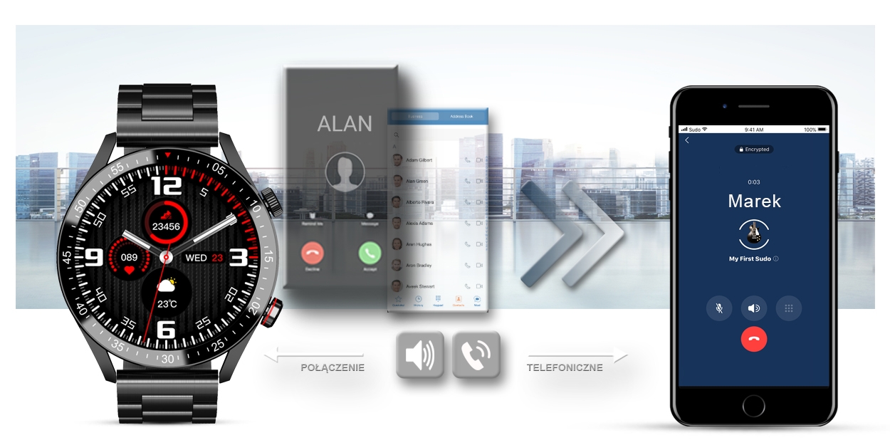 Po sparowaniu smartwatcha z twoim smartfonem, możesz bezproblemowo odbierać i wykonywać połączenia telefoniczne. Wbudowany głośnik oraz mikrofon pozwala rozmawiać bez konieczności wyciągania telefonu komórkowego.