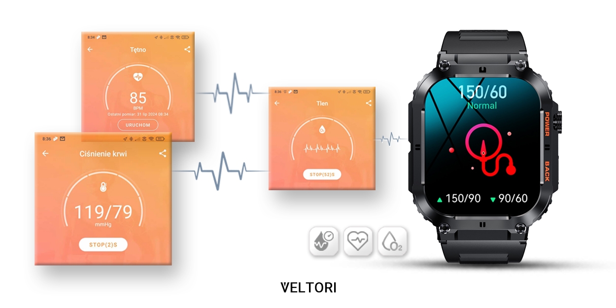 Dzięki sensorowi możesz w każdej chwili zmierzyć lub wykonać pomiar: ciśnienie krwi, tętno lub saturację – zawartość tlenu we krwi w swoim organizmie. Kontroluj wyniki podczas każdej aktywności fizycznej. Niezależnie czy jeździsz na rowerze, biegasz, czy też po prostu jesteś w pracy lub odpoczywasz. Twój smartwatch Veltori stanie się osobistym asystentem dbającym o twoje zdrowie każdego dnia.