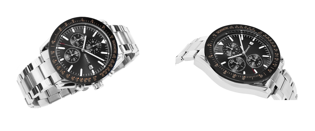 Tarcza:Analogowa z chronografami sekund stopera, minut stopera, trybu czasu 24-godzinnego oraz datownik dni miesiąca
